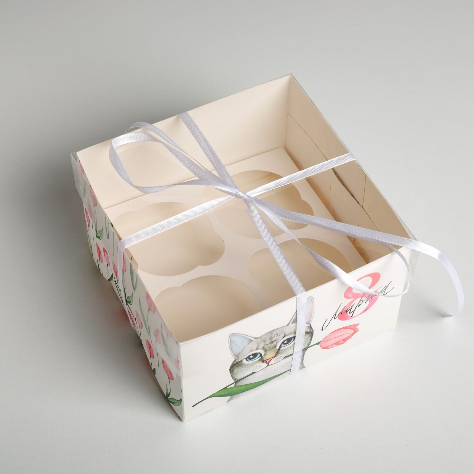 Коробка для капкейков 4 шт "8 марта с котиком!" 160*160*100 мм