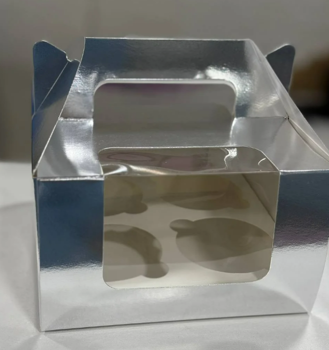 Коробка для капкейков 4 шт с окошком 160*160*195 мм (серебро)