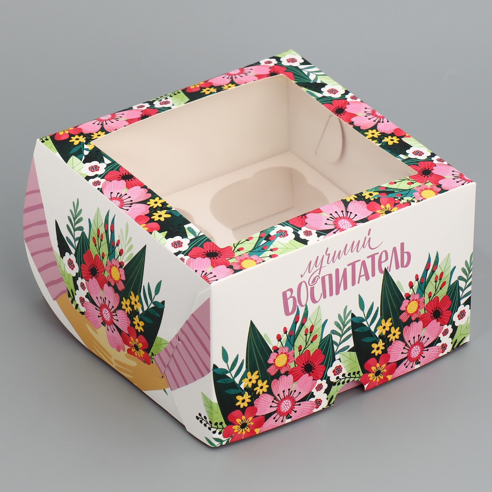 Коробка для капкейков, кондитерская упаковка с окном, 4 ячейки «Лучший воспитатель», 16 х 16 х 10 см