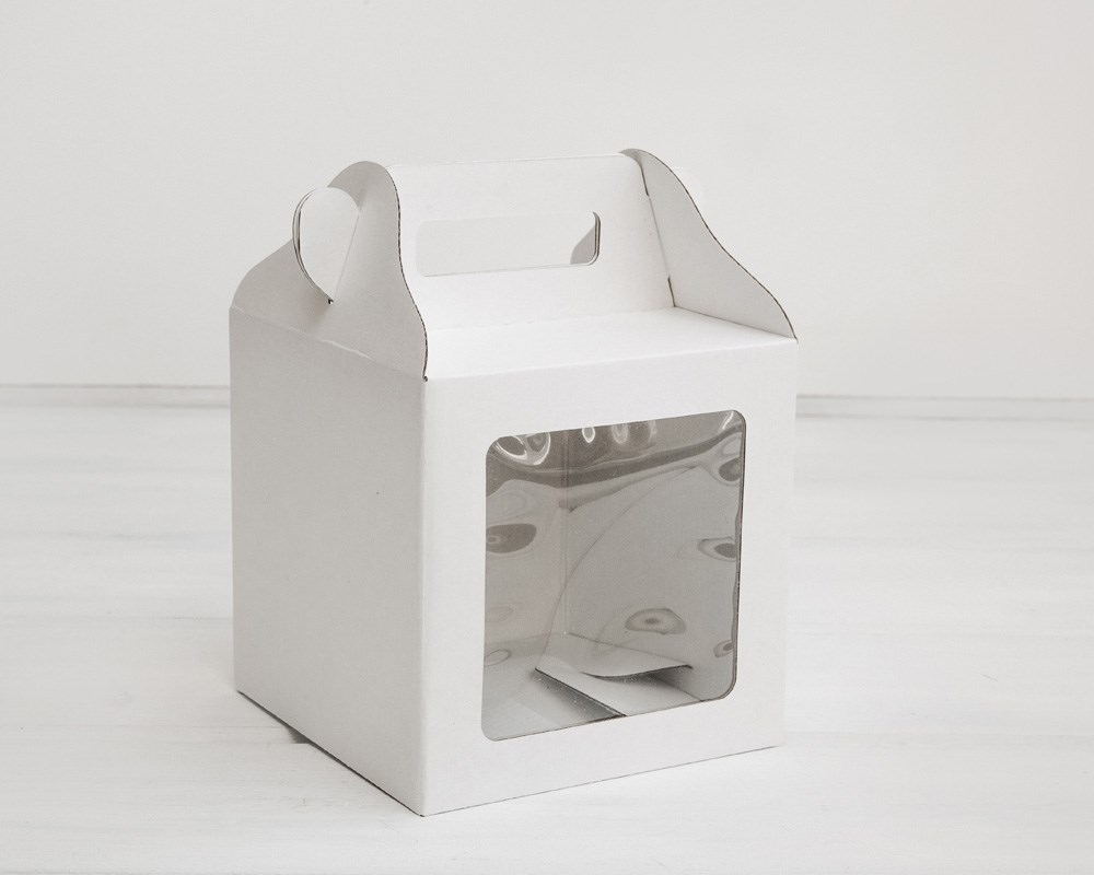 Коробка для торта с ручкой и окном картон 185*185*230 мм (белая)